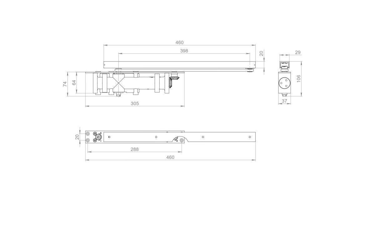 В комплектацию входят: корпус доводчика с монтажной планкой, направляющая с фиксатором, штанга, комплект крепежа, подробная инструкция по установке.