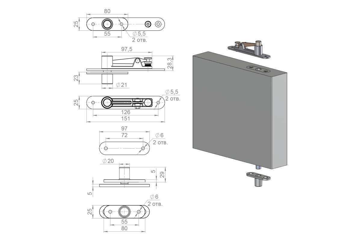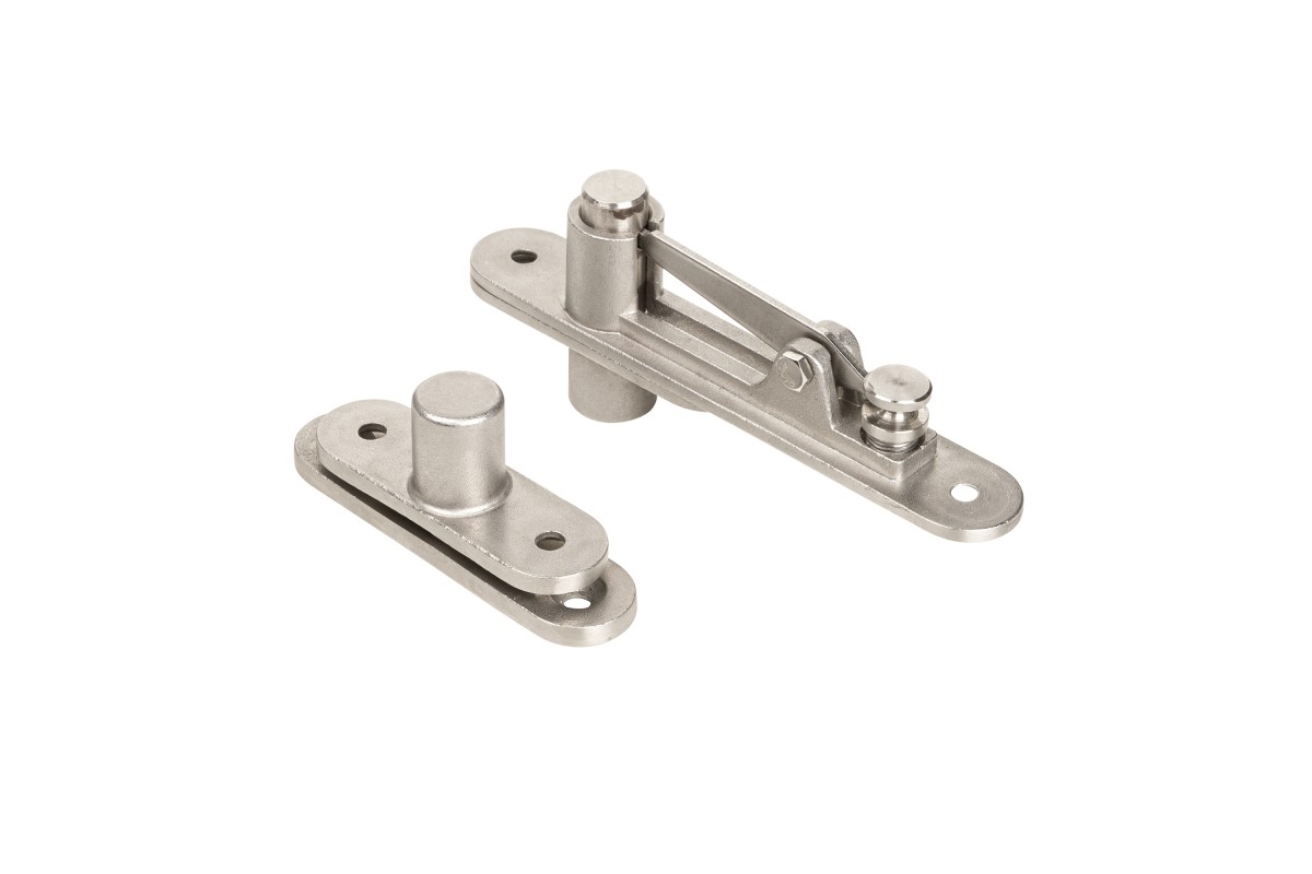 Комплект для маятниковых дверей состоит из верхней и нижней пететь. Подходят для деревянных дверей шириной до 1 500 мм. и высотой до 2 800 мм. весом до 100 кг. Петли без функции довода и фиксацию 90°.