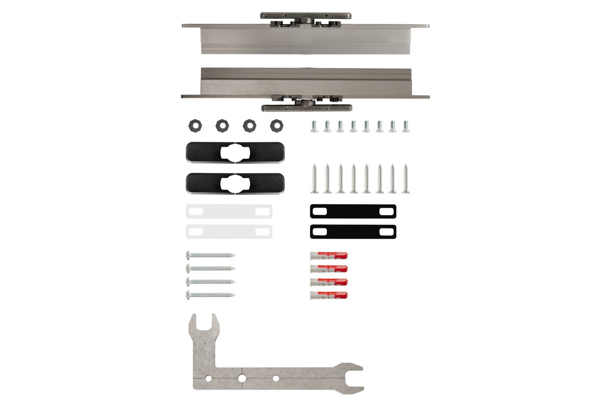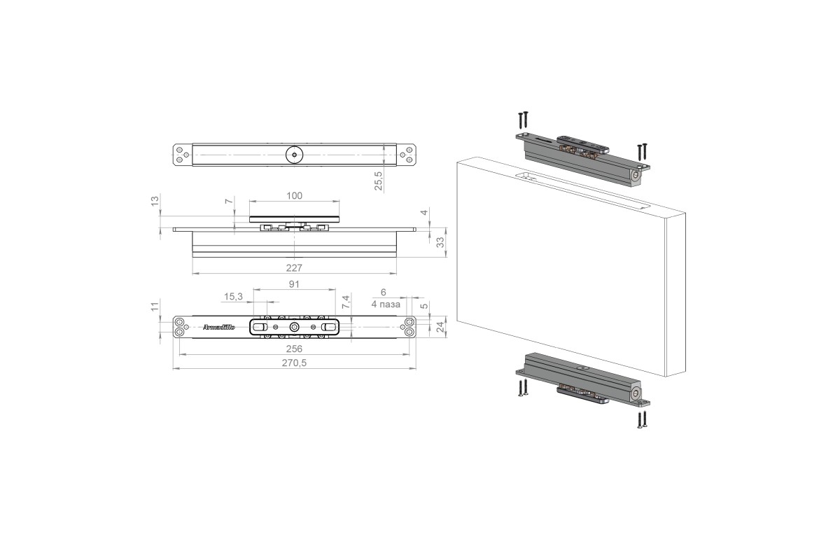 Комплект для маятниковых дверей состоит из верхней и нижней пететь подходят для деревянных и профильных двери шириной до 2 250 мм. и высотой до 4 000 мм. весом до 150 кг. Петли имеют функцию доводчика и фиксацию 90° и в положении 0. Пивот может быть установлен как с краю дверного полотна, так и по центру.
