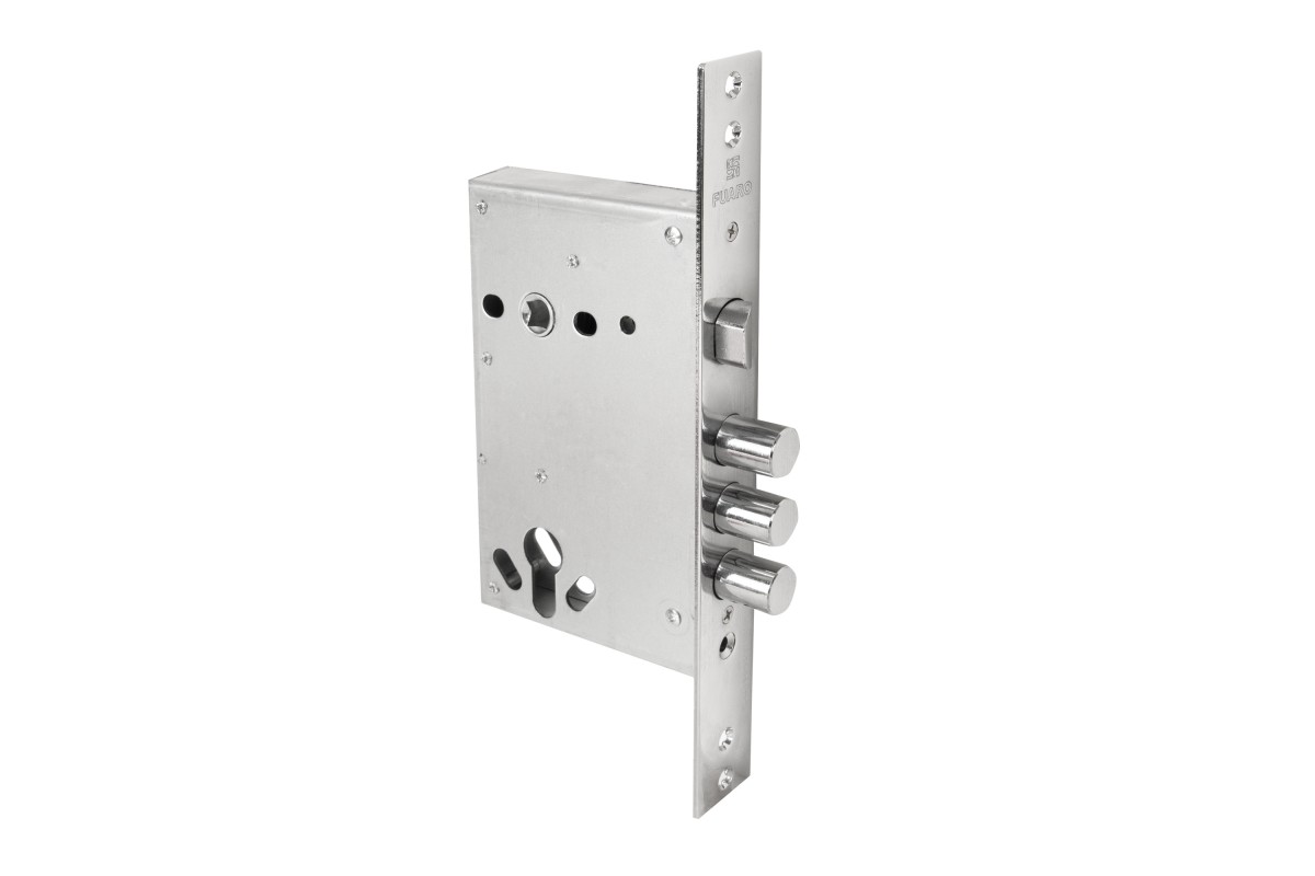 Полуавтоматический корпус врезного цилиндрового замка Fuaro MDV32.11/C-60.85.3R16 S/A (semi-automatic) с тремя ригелями и защелкой предназначен для установки во входные металлические двери.