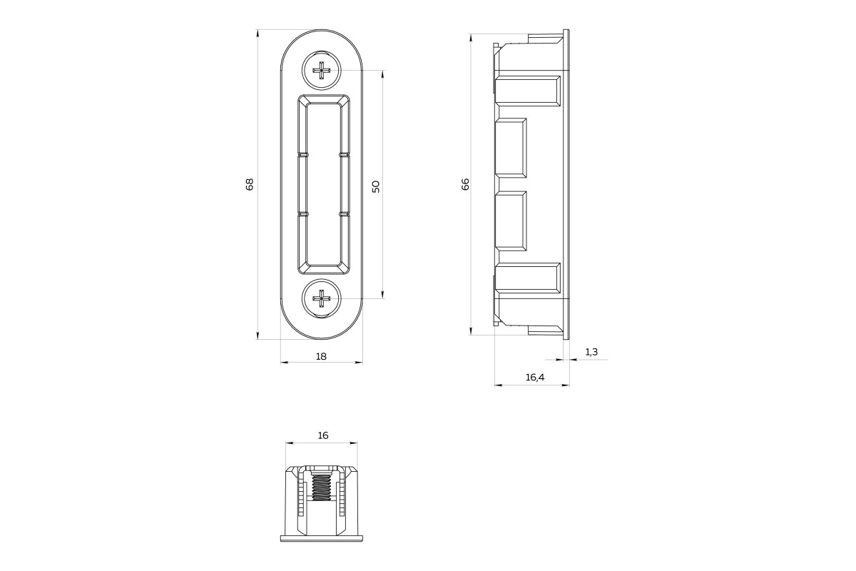 Ответная часть Alutop врезается в коробку полностью и практически не видна. Крепится двумя саморезами, отверстия под которые расположены под углом и утоплены в самой планке. Магнитный элемент встроен в ответную часть.
