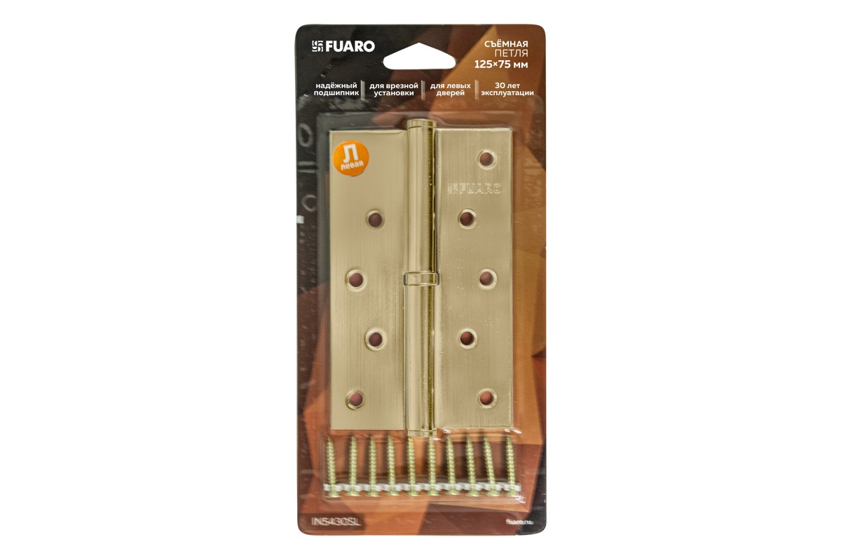 Съемная дверная петля Fuaro 413/BL-5 правая изготовлена из стали, подходит для дверей правого открывания. Гальваническое покрытие прошло тест на устойчивость к коррозии в соляном тумане - более 96 часов, что соответствует высшему 4 классу стойкости покрытия. Края петель прошли дополнительную полировку. В петле 413/BL-5 установлены подшипник и стальной стержень, что обеспечивает 1 млн циклов открывания/закрывания. Максимальная нагрузка на 2 петли 40 кг, на 3 петли 65 кг. Размер петли: 125x75x2,5. Цвет: бронза. Саморезы в комплекте. Гарантия: 5 лет. Упаковка: блистер.