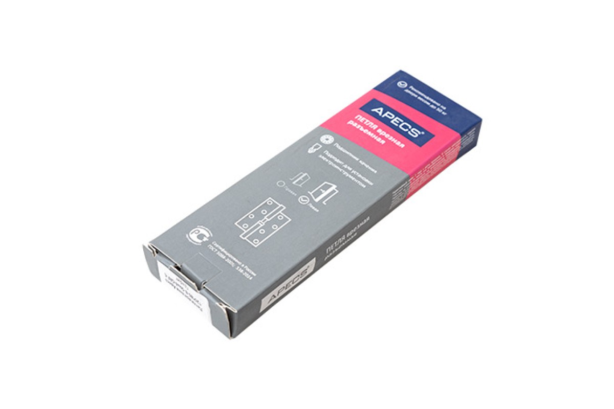 Разъемные врезные петли Apecs - одно из самых качественных предложений на рынке стальных петель. Предназначены для деревянных межкомнатных дверей. Петли Apecs прошли испытания в России и сертифицированы согласно ГОСТ 5088-2005. Укомплектованы подшипниками качения, обеспечивающими плавность хода и долгий ресурс службы. Закаленные саморезы позволяют использовать электроинструмент при установке. Рекомендации по установке петель в зависимости от веса дверного полотна: - максимальный вес двери на 2 петли: 100*70-B - 40 кг, 120*80-B - 50 кг; - максимальный вес двери на 3 петли: 100*70-B - 50 кг, 120*80-B - 70 кг.