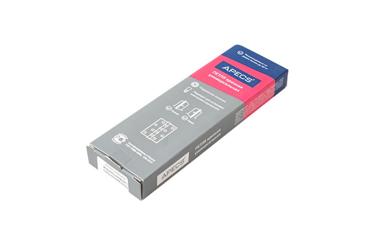 Универсальные врезные петли Apecs - одно из самых качественных предложений на рынке стальных петель. Предназначены для деревянных межкомнатных дверей. Петли Apecs прошли испытания в России и сертифицированы согласно ГОСТ 5088-2005. Укомплектованы подшипниками качения, обеспечивающими плавность хода и долгий ресурс службы. Закаленные саморезы позволяют использовать электроинструмент при установке. Рекомендации по установке петель в зависимости от веса дверного полотна: - максимальный вес двери на 2 петли: 100*70 - 50 кг, 120*80 - 60 кг. - максимальный вес двери на 3 петли: 100*70 - 60 кг, 120*80 - 80 кг.