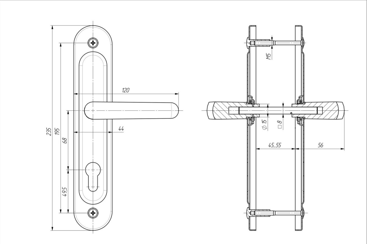 Ручки на планке под цилиндровый механизм. Предназначены для китайских металлических дверей толщиной 45-55 мм. Межосевое расстояние 68 мм.