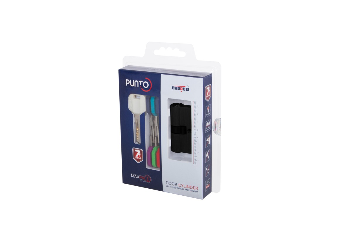 Новая серия цилиндровых механизмов MaxPro TM Punto — надежность и удобство в каждой детали. Цинковый корпус с латунным ротором, стальной пин от высверливания, защита от бампинга и отмычек, секретность -45 000 комбинаций. Продукция поставляется в прочной блистерной упаковке с голограммой, подтверждающей оригинальность товара. Удобный подвес с оригинальной вырубкой делает её практичной для размещения в торговых точках. Дополнительное преимущество — линейка на упаковке, которая помогает быстро и точно подобрать нужный размер цилиндра. В комплект входят 7 ключей с разноцветным ударопрочным пластиковым покрытием, что обеспечивает удобное использование и быструю идентификацию.