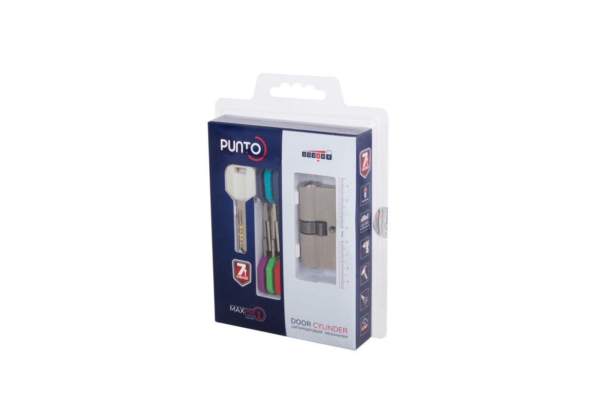 Новая серия цилиндровых механизмов MaxPro TM Punto — надежность и удобство в каждой детали. Цинковый корпус с латунным ротором, стальной пин от высверливания, защита от бампинга и отмычек, секретность -45 000 комбинаций. Продукция поставляется в прочной блистерной упаковке с голограммой, подтверждающей оригинальность товара. Удобный подвес с оригинальной вырубкой делает её практичной для размещения в торговых точках. Дополнительное преимущество — линейка на упаковке, которая помогает быстро и точно подобрать нужный размер цилиндра. В комплект входят 7 ключей с разноцветным ударопрочным пластиковым покрытием, что обеспечивает удобное использование и быструю идентификацию.