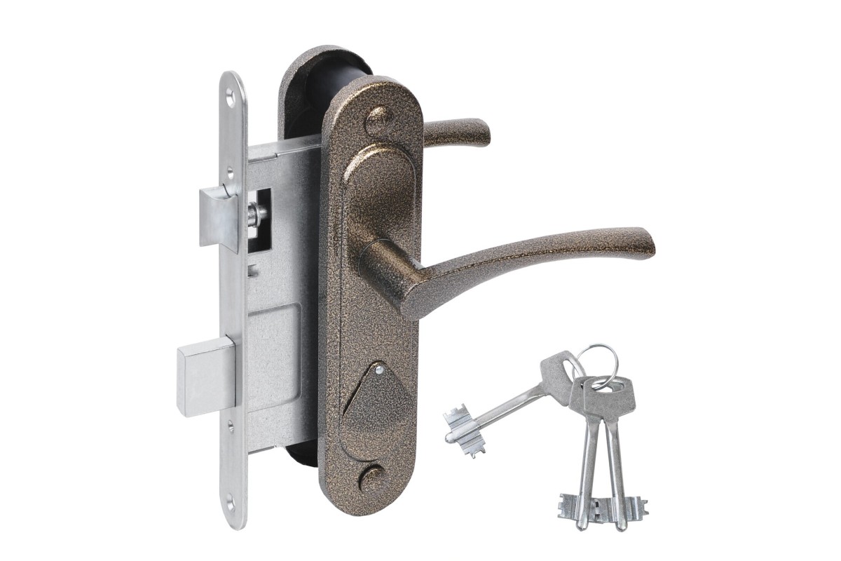 Замок врезной с ручками. Предназначен для установки в деревянные двери толщиной до 45мм, правого и левого открывания. Ригель прямоугольного сечения, вылет 22мм. Универсальная защелка. Стальной корпус, покрыт гальваническим покрытием. Межосевое расстояние 67 мм. Удаление ключевого отверстия 55мм. Материал ручек алюминиевый сплав. Ручки оснащены пружинами возврата. Комплектация: замок, 3 ключа, ручки, ответная планка, винтовые стяжки.