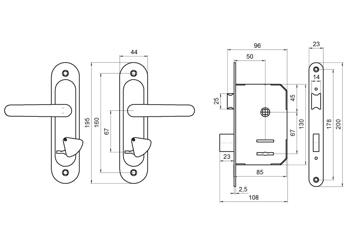 Замок врезной с ручками. Предназначен для установки в деревянные двери толщиной до 45мм, правого и левого открывания. Ригель прямоугольного сечения, вылет 22мм. Универсальная защелка. Стальной корпус, покрыт гальваническим покрытием. Межосевое расстояние 67 мм. Удаление ключевого отверстия 55мм. Материал ручек алюминиевый сплав. Комплектация: замок, 3 ключа, ручки, ответная планка, винтовые стяжки.