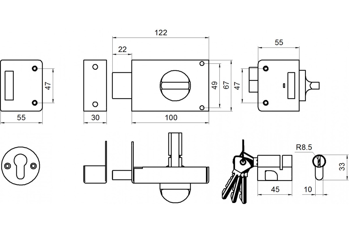 Замок накладной цилиндровый ЗН-1 предназначен для установки в деревянные и стальные двери правого и левого открывания толщиной до 45 мм. Окрашен полимерной краской, цвет: бронза. Ригель стальной прямоугольного сечения. Закрывание и открывание изнутри производится вертушкой, снаружи ключом. Имеется блокировка от открывания ключом снаружи, путем доворота вертушки в крайнее положение при открытом ригеле. Механизм секрета цилиндрический односторонний с английским ключом. Укомплектован 4-мя ключами, запорной коробкой и накладкой.