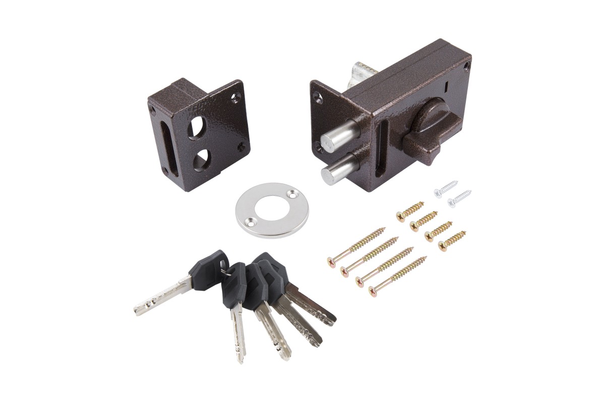 ЗН1-М1 КМЗ популярная модель накладного замка. Надежный цилиндровый механизм с 5 перфорированными ключами. Металлический корпус окрашен в медный антик. Предназначен для установки в деревянную дверь. Совместим по посадочным размерам с замками ЗН1-М1 производства КЭМЗ Калуга.