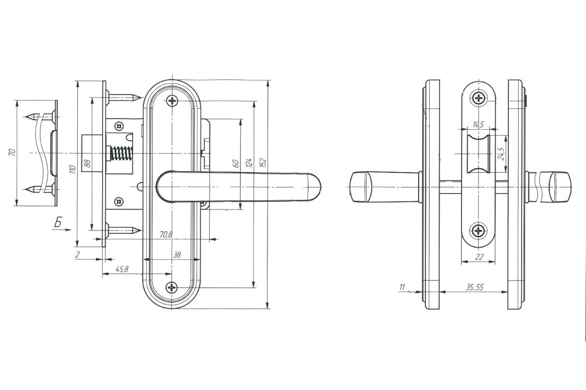 Защелка врезная с ручками. Предназначена для установки в деревянные двери толщиной до 45мм, правого и левого открывания. Универсальная защелка. Стальной корпус, покрыт гальваническим покрытием. Удаление ключевого отверстия 45мм. Материал ручек алюминиевый сплав. Комплектация: защелка, ручки, ответная планка, шурупы.