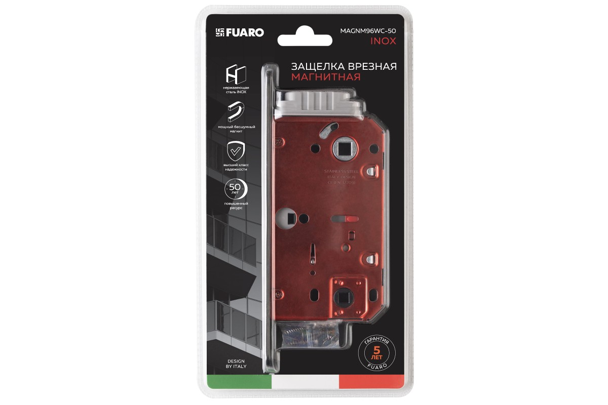 ИТАЛЬЯНСКАЯ СТРАСТЬ Бесшумная магнитная защелка Fuaro MAGNM96WC-50 INOX с лицевой планкой из нержавейки стали с магнитным механизмом изготовлена в соответствии с требованиями ГОСТ 5089-2011. Предназначена для установки в межкомнатные и сантехнические двери, благодаря нержавеющей лицевой планке могут использоваться в ванных комнатах и помещениях с повышенной влажностью. Магнитный механизм обеспечивает бесшумность работы защелки. Корпус врезного замка MAGNM96WC-50 имеет высший 4 класс надежности (250 000 циклов открывания/закрывания). Бэксет - 50 мм. Межосевое расстояние - 96 мм. В комплектацию входят: магнитная ответная планка и крепежная фурнитура в цвет изделия. Упаковка - наглядный и удобный продающий блистер. Корпус яркого, притягивающего внимание покупателей, цвета.